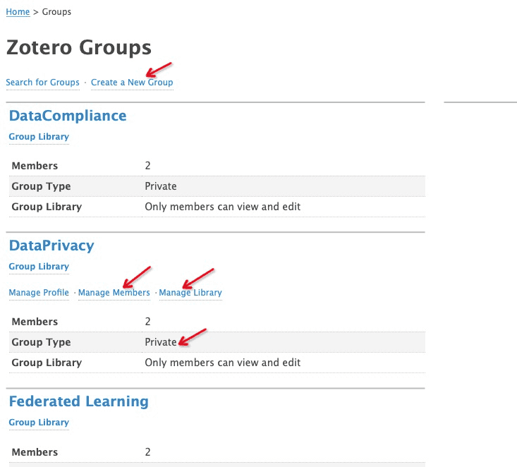 For grouped libraries, you can create groups, choose group settings and invite collaborators (my username is: tuliplab).