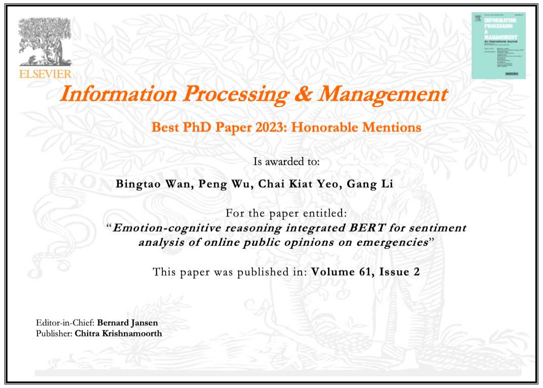 The paper titled "Emotion-cognitive reasoning integrated BERT for sentiment analysis of online public opinions on emergencies", has been selected as the 2023 Best Ph.D. Paper Award Winner: Honorable Mentions.